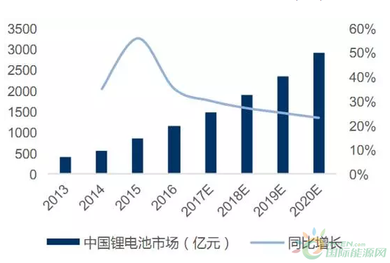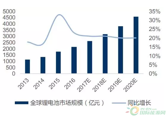 全球市场规模2020年有望达到4500亿。2016年受新能源汽车政策推动,我国锂离子电池年产量飙升至78亿只,同比增长高达40%。全球锂离子市场规模近年稳定上升,2016年全球规模达2158亿元,2011-2016年复合增长率21%。预计2020年全球锂离子电池市场规模有望达到4500亿元,其中我国锂离子电池市场规模有望达到3000亿元。