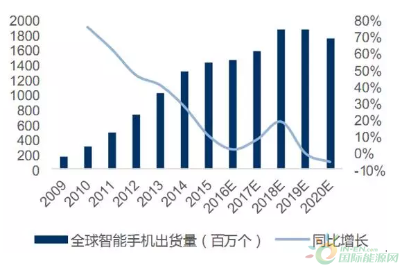 3C类产品发展减缓,导致消费类锂电池需求增速降低。3C类产品在经历过发展的黄金阶段之后,智能手机产品等市场已趋近于饱和。全球智能手机的出货量增速,从2010年的高达76%,降低至2015年10%。根据估算,2016年全球智能手机出货量达到15亿个,但同比增速仅2%,而到2019-2020年可能会出现负增长。