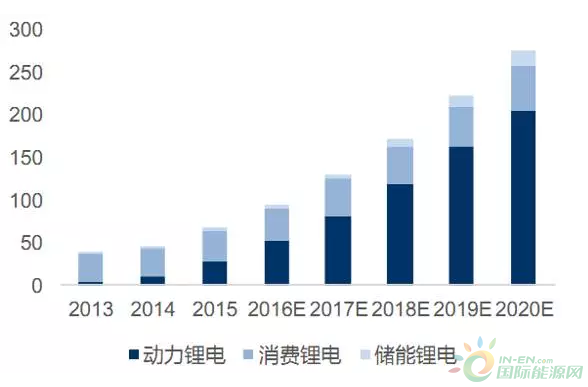 锂离子电池根据应用场景可分为动力、消费和储能三种。传统的消费锂电池主要应用于手机、笔记本电脑、数码相机等3C类产品,2015年占全球各类锂电池出货量的62%,但随着全球对新能源汽车需求量的增加,消费类锂电池应用的占比逐年下降。根据预测,我国动力锂电池在锂电池全部应用中的占比有望从2015年的34%上升至2020年的70%,动力电池将成为锂电池的主要应用场景。此外,储能锂电池作为新兴应用场景也逐渐受到重视,预计市场占比从2015年的6%小幅上升至2020年的8%。