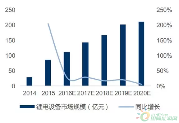 我国锂电设备市场空间2020年预计到210亿。根据中国预测,假设动力锂离子电池实际产能利用率为55-70%,消费和储能锂电产能利用率90%,到2020年我国锂离子电池产能预计将超过270GWh。我们假设每GWh的动力锂电池产能对应的总投资约6亿元,其中设备投资占比65%,而国产设备占比到2020年有望提升到100%,则每GWh产能释放对应的国产设备投资约3.9亿元,预计2020年我国锂电设备规模约210亿元,2016-2020年复合增长率约17%。